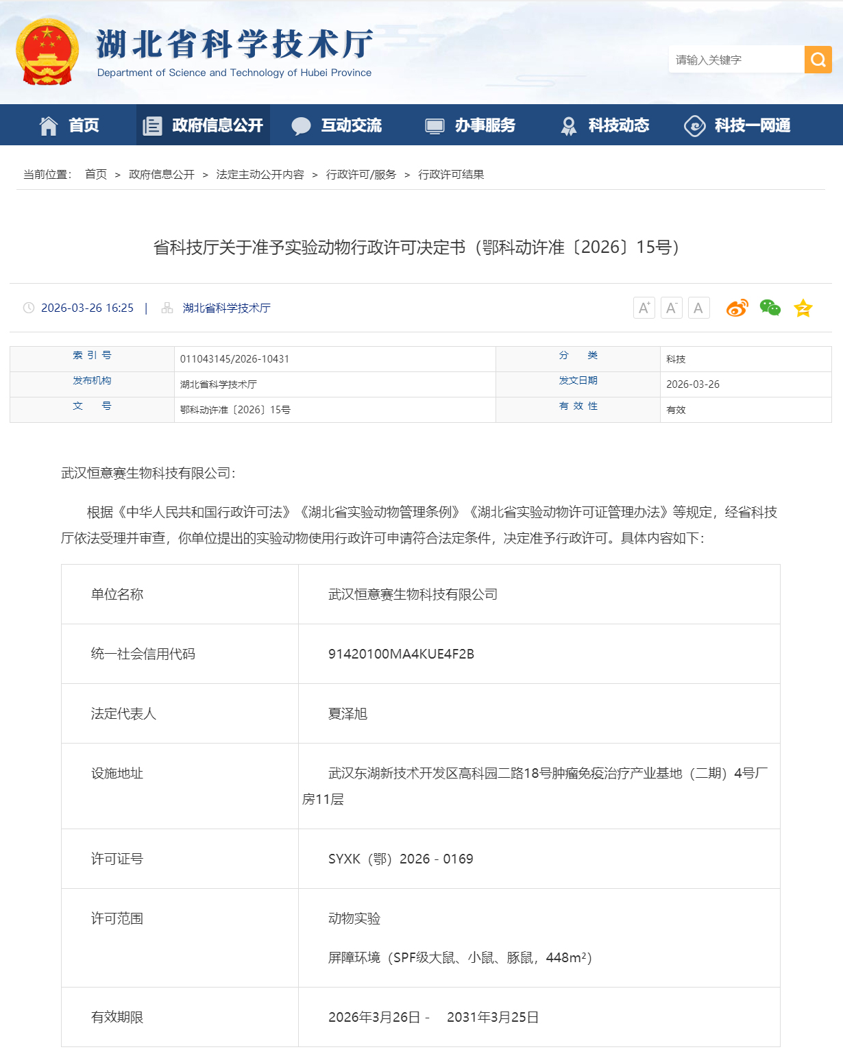 近日,经湖北省科学技术厅严格评审,武汉恒意赛生物科技有限公司正式获批《实验动物行政许可证》(许可证号:SYXK(鄂)2026-0169)。这标志着我司在实验动物设施规范化、管理标准化方面迈上了新台阶,科研实力获得权威认可。